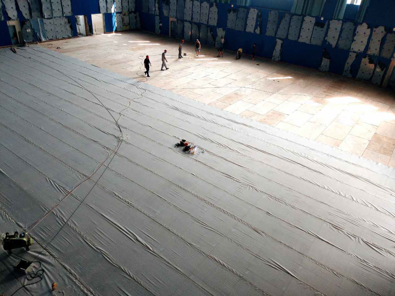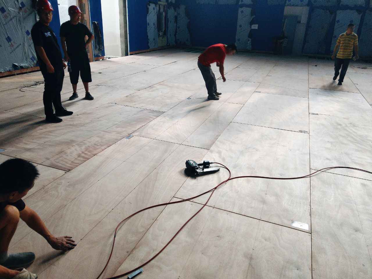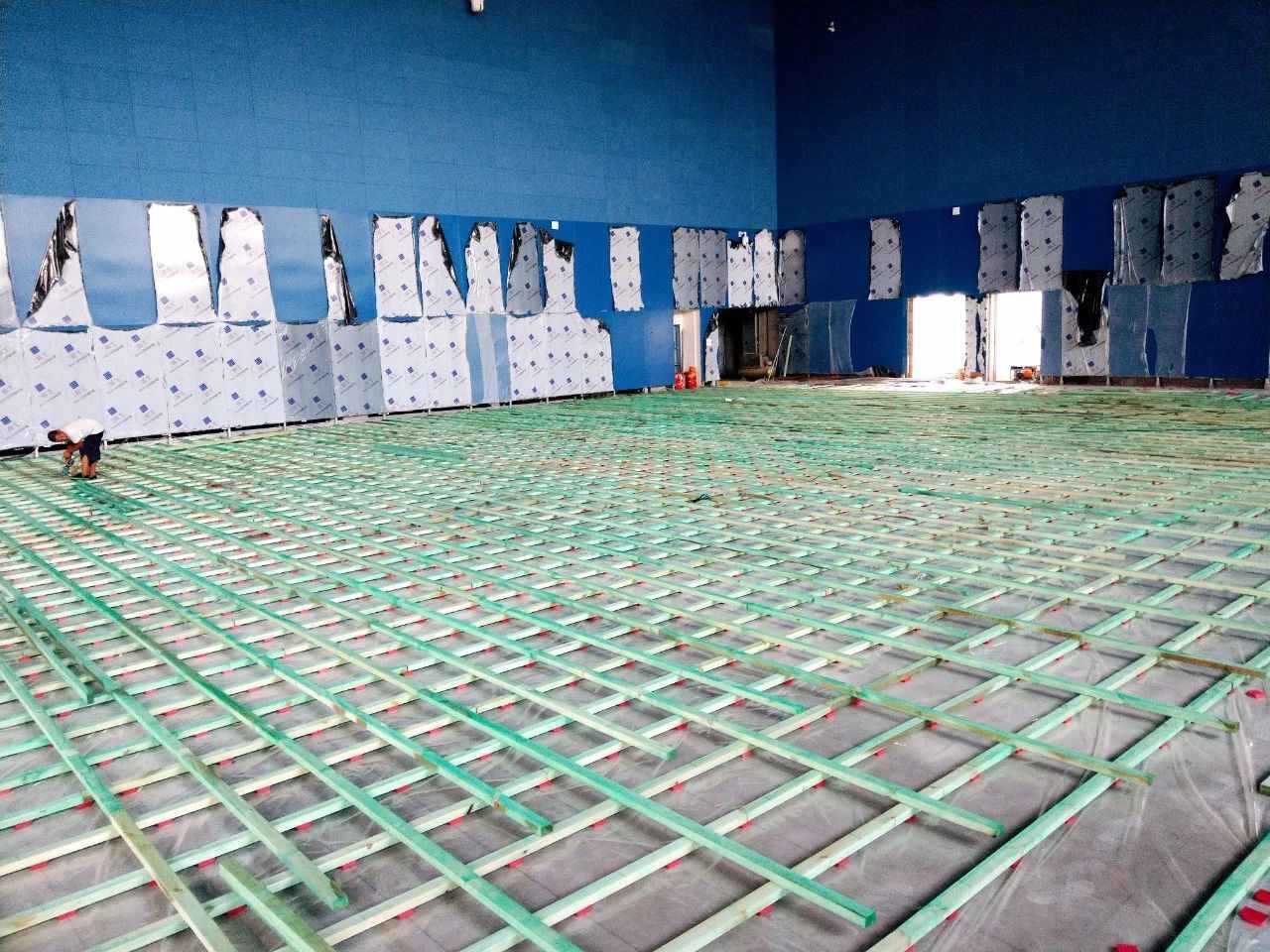 Lap-laying method is adopted for the moisture-proof plastic sheet on the bottom layer. The fixed and firm spacing of rubber pads is 450mm. The site is designed as a double-layer sleeper structure with suspended paving. The lower sleeper is laid out along the long direction of the venue with a distance of 450mm. The upper sleeper is laid along the short direction of the venue, and the two sides are laid out parallel to the short side with a distance of 400mm; Reserve a 10--20mm wide expansion gap, and use rubber pads to cushion the sleeper joints.